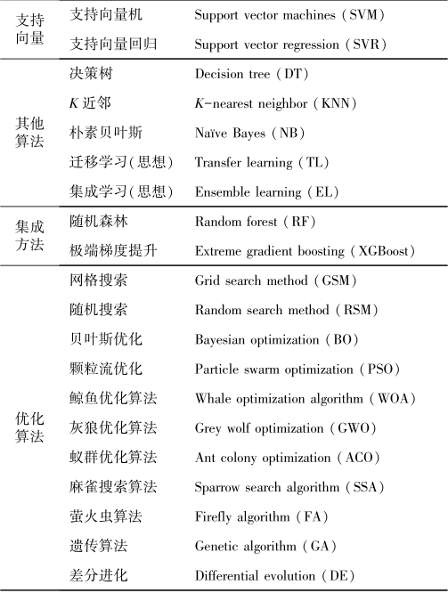 为实现模型超参数的精准调优,学者们提出了多种超参数智能优化算法,如 GSM、RSM、BO、元启发式算法等。 其中, 元启发式算法基于进化的GA 、DE和基于种群智能优化的PSO 、WOA 、GWO、SSA、FA 、ACO,已在模型超参数优化上取得了广泛应用。 表 4 总结了常见优化算法的优缺点。 然而,当数据库容量较高且模型超参数种类繁多时,采用智能优化算法调参往往会急剧增加计算成本,此时模型最优超参数的确定只能依赖于传统的试错法和微调法, 这一难题亟待解决。