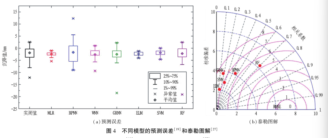 在同一案例中对比不同机器学习模型的预测效果,从而找到最优的预测模型( 本节括号中的数据均为模型在测试集中的结果) 。 例如: 在最大地表沉降预测中,Chen 等认为 GRNN ( EMAE = 1. 66) 相比于BPNN ( EMAE = 2. 07) 和 RBF( EMAE = 2. 15) 有更高的预测精度; Chen 等进一步发现 GRNN ( EMAE = 1. 60)和 RF ( EMAE = 1. 85) , SVM ( EMAE = 1. 70) 相比于 ELM( EMAE = 2. 22) , MLR ( EMAE = 2. 31) 和 WNN ( EMAE =2. 18) , BPNN ( EMAE = 3. 35) 在沉降预测中表现出更高的预测精度, 但 SVM 的泛化能力较差不易使 用;Zhang 等基于同一数据库[19,26] 发现, RF ( EMAE =3. 03) 的沉降预测能力优 于 BPNN ( EMAE = 4. 20 ) ,GRNN ( EMAE = 4. 09) , SVM ( EMAE = 3. 74 ) 和 ELM( EMAE = 3. 99) 。 此外, Mahmoodzadeh 等认为深层网络模型 DNN ( EMAE = 2. 06) 和 LSTM ( EMAE = 2. 74)的沉降预测能力优于传统网络模型( KNN, GPR, DT,SVR 和 LR) 。 不同模型的预测误差和泰勒图解如图 4所示。