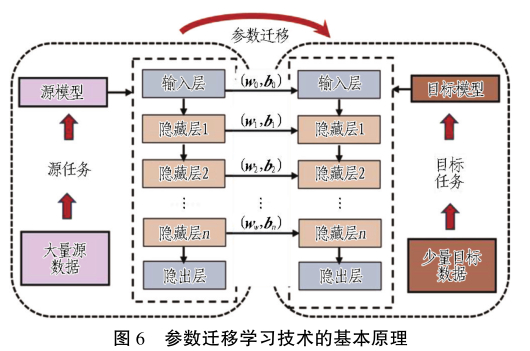 练数据集的适用性和有效性,致使 Dolsw-SVM 的沉降预测相对误差低于 SVM; Mohammadi 等认为当数据集不足以支撑模型进行预测时,可采用数值分析法模拟现场工况来扩充数据集; 尽管 Zhou 等 、陈仁朋等和 Zhang 等都认同 RF 具备较高的沉降预测精度,但 Mohammadi 等指出 RF 需要大量训练数据来确保其预测结果的准确可靠性。 值得一提的是,当存在高质量源数据且预测任务相关性较高时,迁移学习技术可有效解决数据集不充分的问题并保证预测的准确有效性,例如: Zhou 等采用参数迁移学习技术发现其预测精度相比 ANN 和 SVM 更高。 参数迁移学习的基本原理如图 6 所示。 图中 w 表示权重向量,b表示偏置向量。 为证实所提出的模型在不同案例中的适用性,对比了相同模型在不同数据集下的预测效果。例如: Tang 等 使用数据集A构建了不同模型( DNN, RF, SVM, BPNN) ,并通过数据集 B 来验证这些模型的沉降预测性能,其中 RF 模型在 2 种数据集中均表现出优异的沉降预测效果。 此外,Zhang 等还考虑了盾构掘进过程中邻近建筑物对地表沉降预测的影响。