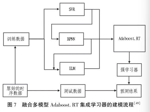 数据均为模型在测试集中的结果) 。 采用不同模型对地表沉降发展过程进行预测和对比分析。 例如: Li等发现 LSTM( EMAE = 0. 79) 的沉降预测精度略高于GRU( EMAE = 0. 81 ) , 且二者的预测精 度均优于 RF( EMAE = 1. 02) ; 陈仁朋等[2] 则强调 RF 具有优异的沉降预测精度,同时具备优异的全局预测能力,可有效识别局部异常点位,适用于地表沉降发展过程的动态预测研究。 融合多模型 Adaboost. RT 集成学习器的建模流程如图 7 所示。 Yan 等在 Adaboost. RT 的基础上使用 BPNN、ELM 和 SVR 建立了集成学习器,结果表明: 集成学习器的预测效果显著优于单 一 模型( BPNN、ELM 和 SVR) 或 Adaboost 与单一模型所构建出的组合模型( Adaboost. RT - BPNN/ELM/SVR) 的预测效果。