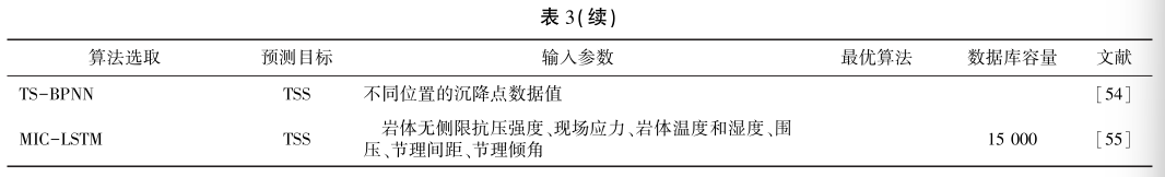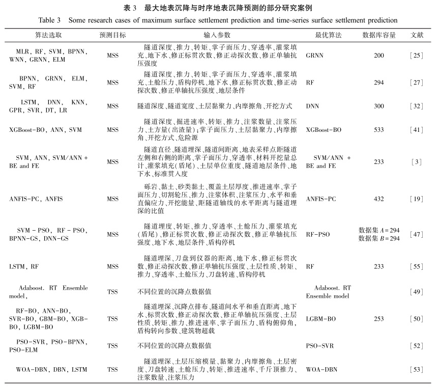 综上,传统的全连接神经网络并不适用于 TSS 预测,而 LSTM 可通过记忆单元捕捉和存储每一时间步前后的信息,实现地表沉降发展过程的动态预测,并缓解 RNN 中常出现的梯度消失和爆炸的问题; RF 因具备较强的全局预测能力也常被用于 TSS 预测中。 为快速高效地优化模型的超参数并实现准确地预测,可采用 BO、PSO 和 WOA 等优化算法在测试集中对优化后模型的预测效果进行验证。 此外,最大信息系数和数据驱动特征选择法也为模型输入参数的筛选提供了新思路。 表 3 总结了MSS 和 TSS 预测局部分案例中的主要算法。