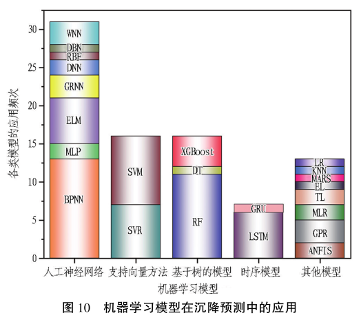 机器学习具有独特的信息处理能力、强大的预测能力和灵活的网络架构,可处理变量间复杂的非线性关系,在盾构掘进地表沉降预测中展现出了强大的应用潜力。 图 10 统计了近十年各类地表沉降机器学习预测模型的应用频次。 结合第 4 节的分析可知: 人工神经网络、支持向量方法和基于树的方法等传统算法常被用于最大地表沉降的预测中。