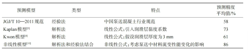 现场实测数据表明,基于混凝土和润滑层流变参数的泵送压力模型的预测精度远高于现行规范推荐的方法。国内学者提出了一种非线性泵压损失预测模型,该泵压预测模型中考虑了泵送作用下混凝土流变性能变化导致的泵压损失沿程变化,提升了水平和垂直泵送条件下的泵压损失预测精度,如表1所示。