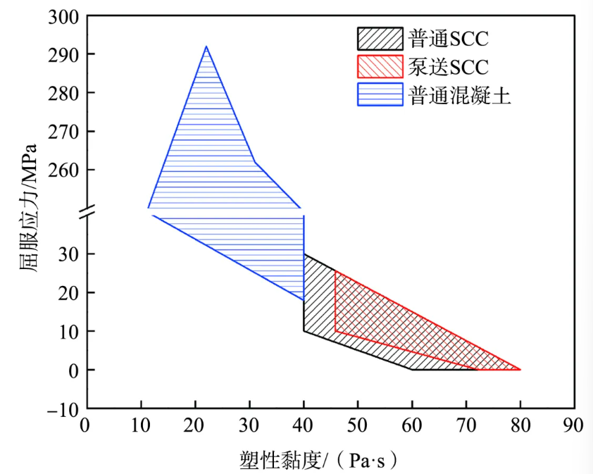 (超)高性能混凝土具有优异的耐久性、力学性能和自密实性,是混凝土材料的重点发展方向之一。低水胶比和高外加剂掺量是(超)高性能混凝土的配合比特征,其流变性能表现为低屈服应力、高黏度、高触变性和剪切增稠等特性,典型代表包括自密实混凝土(Self-Consolidating Concrete, SCC)和超高性能混凝土(Ultra-High Performance Concrete, UHPC)。图2展示了SCC和普通混凝土的流变性能推荐范围。SCC的高黏度和低屈服应力加剧了管道内混凝土的剪切流动,导致混凝土泵送后黏度降低。为了保证泵送后SCC的黏度能够维持新拌性能的稳定性,适用于泵送的SCC(图2中称为泵送SCC)的流变参数范围进一步收窄。(超)高性能混凝土的高黏度增加了混凝土管道泵送的压力,提高了混凝土管道泵送难度,加剧了泵送压力对泵后混凝土性能的影响。国内学者开展了不同强度等级普通混凝土、大流动性混凝土和SCC(C30、C40、C60、C80和C100)的大型足尺盘管泵送试验,系统研究了混凝土在泵送过程中的剪切作用,建立了剪切能与泵后混凝土黏度变化之间的关系,探究了泵送过程中的压力、剪切和温度等因素对混凝土性能的影响规律,发现泵送参数对混凝土水化、流变性能和孔隙结构均有较大影响。