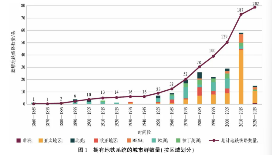 图1示出了按10年和区域划分的、至少拥有1条地铁线路的城市群数量演变情况。区域划分突显了亚太地区地铁线路持续增长,以及从2010年起MENA地区的增长。2010—2023年间,全球共有73个新的城市群开通了地铁系统;其中近一半位于中国,中国2010—2022年每年至少有1个城市群开通地铁线路(2023年,中国拥有地铁的城市群总数占全球的21%)。从2010年起,亚太地区有54个新城市开通了至少1条线路,MENA地区9个,拉丁美洲4个,欧洲和北美2个,撒哈拉以南非洲1个,欧亚地区1个。