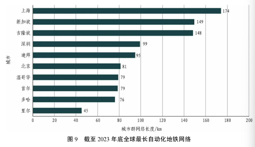 2023年全球自动化线路总长2 279 km(占全球地铁总长的11%,如图7所示)。地铁自动化始于1981年,但近年屡创纪录。2020—2023年,自动化地铁长度增长75%,由亚太地区推动,该区域自动化线路最集中(占全球总数的57%),网络最长(占全球总公里数的67%)。欧洲自动化线路占全球的23%,但因线路较短,仅占地铁总长度的15%。城市层面,2023年,中国自动化地铁网络规模(公里数)全球第1,随后是韩国、法国、新加坡和马来西亚。