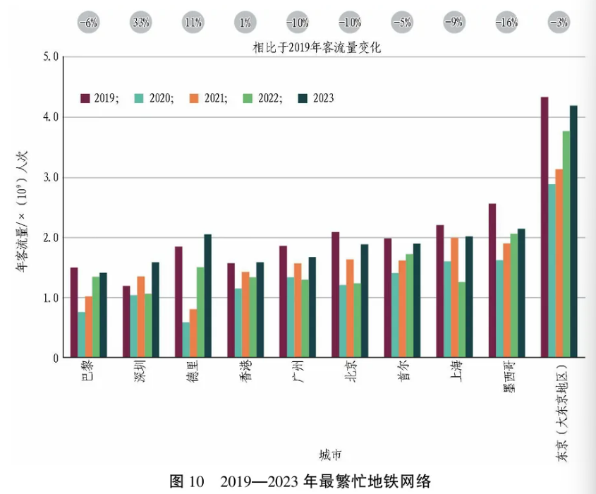 亚太地区是地铁系统最集中的区域,拥有全球43%建有至少1条地铁线的城市群及近2/3的全球地铁网络长度。这2项指标均表明该区域的地铁网络长于其他地区。欧洲拥有全球21%建有至少1条地铁线的城市群,但其地铁网络长度仅占全球的14%。中国在2021—2023年多项供给指标显著增长,延续自1980年代初的趋势,2010—2019年达到峰值。具体而言,中国地铁网络总长度增长37%、线路数量增长33%、站点数量增长31%、车厢数量增长34%。2023年,中国地铁网络长度占全球的43%,地铁客流量占全球的30%。