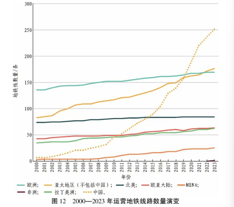本次统计多次提及亚太地区在多项分析指标中领先。图11示出了中国部分指标在2012—2023年的演变,清晰展现了中国在该领域的分量。例如:2012年中国地铁网络长度占全球的19%,2023年增至43%;2012年中国仅有2%的城市拥有至少1条GoA4线路,2023年增至24%。图12示出了2000—2023年运营地铁线路数量变化情况。中国呈现出最为显著的增长态势,亚太地区即使不含中国仍排第2。