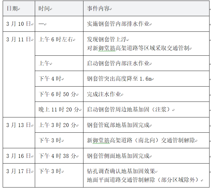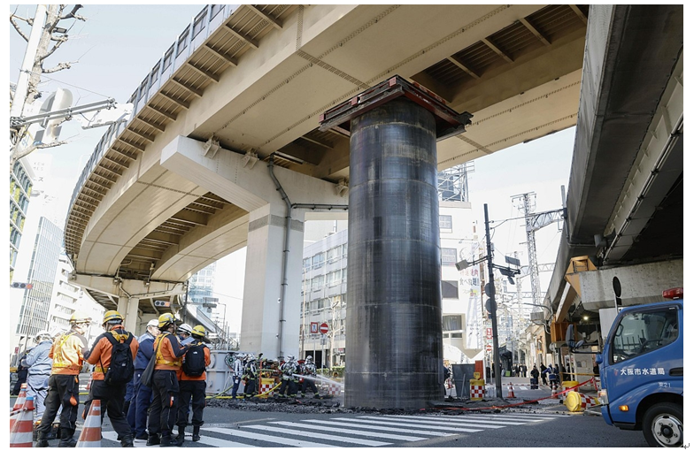 事故发生后,大阪市消防局立即启动应急处置,通过向钢套管内部注水的方式抑制上浮,当日下午4时已将钢套管突出高度降至1.6m。随后,针对钢套管上浮引发的周边地基地层松动问题,大阪市建设局对钢套管周边实施地基加固施工。