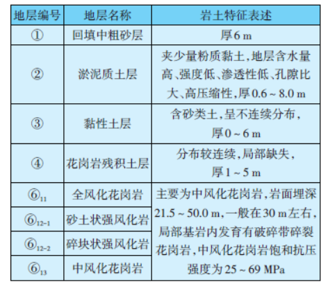 工程所在地隶属华南褶皱系,地质条件相对复杂,地层复杂多变,其中淤泥层最大厚度达15 m,具有含水量高、孔隙比大、压缩性高、强度低、渗透性低、承载力低、易触变与流变等特点。工程区间地质纵断面如图2所示,地层自上而下依次为回填中粗砂层、淤泥质土层、黏性土与砂类土层、花岗岩残积土层,底部为全风化花岗岩、强风化岩层和中风化岩层,以中风化岩层为主,堰筑段隧道岩土层特征见表1。详勘及补勘资料揭示,场地淤泥层厚度变化大、分布广泛,在工程所在地东北部、西南角范围均分布有深厚淤泥,导致地基稳定性极差,承载力为35~60 kPa,在荷载作用下易发生侧向滑移、挤出及不均匀沉降,进而导致围堰与基坑施工面临显著的不均匀沉降风险。