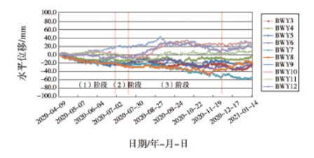东人工岛堰筑段隧道工程采用双排钢板桩围堰(图13)及子围堰设计(图14),建成后围堰稳定性良好,未对工程建设产生负面影响。堰筑段围堰顶部水平位移累计值的历时曲线如图15所示,大体积混凝土浇筑效果如图16所示。可见,采用双排钢板桩围堰及子围堰的设计方式,围堰变形得到有效控制,