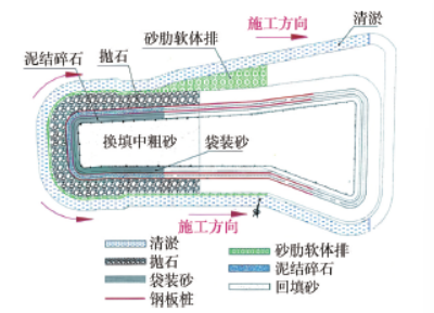 针对复杂海域地层含水量高、强度低、承载能力低、易发生不均匀沉降等工程难点,采用表层清淤、施设钢板桩、围堰地基处理等施工方法,以降低各因素对工程建设的干扰,保障复杂海域临时围堰施工顺利建设。钢板桩围堰平面施工顺序如图8所示,总体为:首先进行表层清淤,整体换填中砂至原海床面;随后打设内外排钢板桩,并在外排钢板桩外侧进行袋装碎石和袋装土护顶、块石抛填以及在内外排之间铺设土工膜;然后进行钢拉杆安装、堰体内中粗砂回填,并进行内排钢板桩内侧反压土坡施工,适时加固反压土坡下方软弱下卧层;最后进行围堰降水和内部场地平整,为围堰结构施工创造条件。
