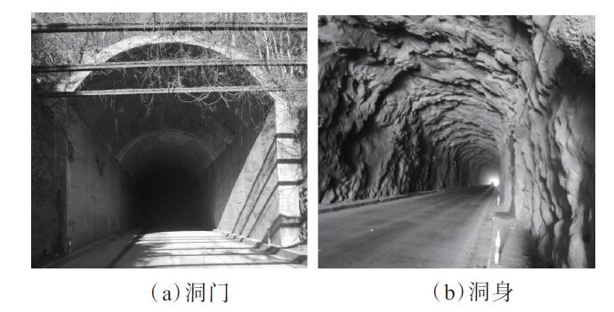 隧道建设年代较早,隧道长约3 600 m,洞内毛洞宽8.2 m,拱顶高8.6 m,行车道宽7.5 m,未通长设置衬砌,局部宽度不满足建筑限界[1-2]要求。隧道为简易通车状态,未设置通风、照明及消防系统,不满足特长隧道交通工程要求[3-5]。隧道洞门及洞身现状见图1。