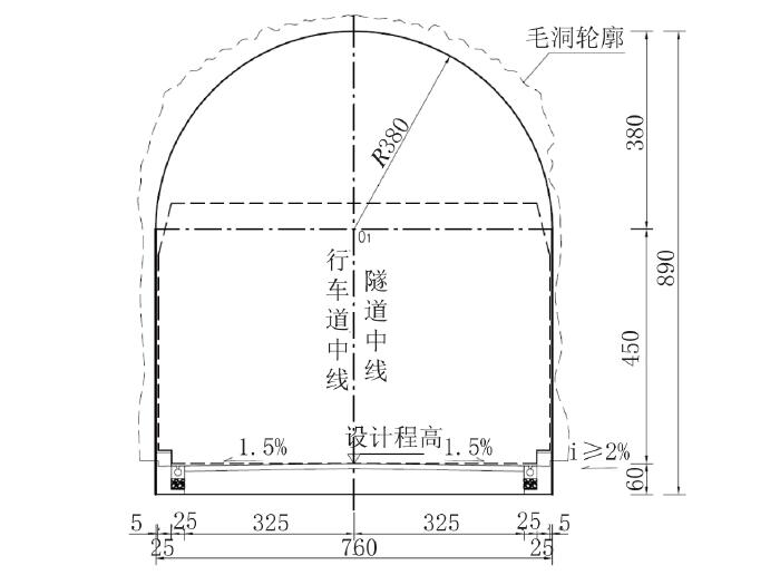 拟合原毛洞断面形式,内空考虑侧墙预留装修层5 cm。主洞拱部采用R=380 cm 圆弧,边墙采用760 cm(宽)×450 cm(高)的矩形断面,主洞衬砌内轮廓见图3。