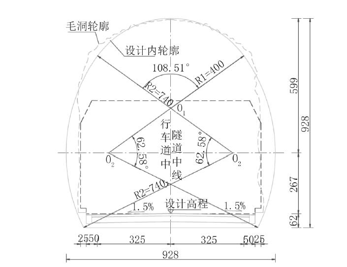 采用受力条件好、断面利用率高、综合管线布置有利的三心圆断面进行比选。主洞内轮廓采用三心圆曲边墙结构,拱部采用R=400 cm 圆弧,边墙采用半径R=740 cm圆弧,主洞衬砌内轮廓见图4。