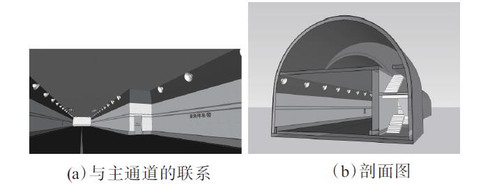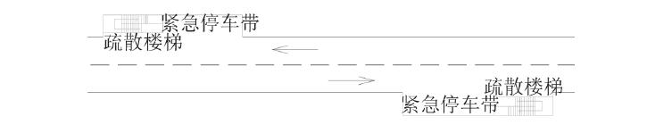 逃生通道出入口结合紧急停车带布置(每隔600 m 一处,左右较差布置),于紧急停车带一端设置疏散楼梯。当隧道内发生紧急情况时,事故被困人员可通过疏散楼梯进入上层应急逃生通道,从而及时撤离隧道危险地带。逃生通道采用纵向通风换气方式,按3 次/h 进行设计。逃生通道与主洞的关系见图11。