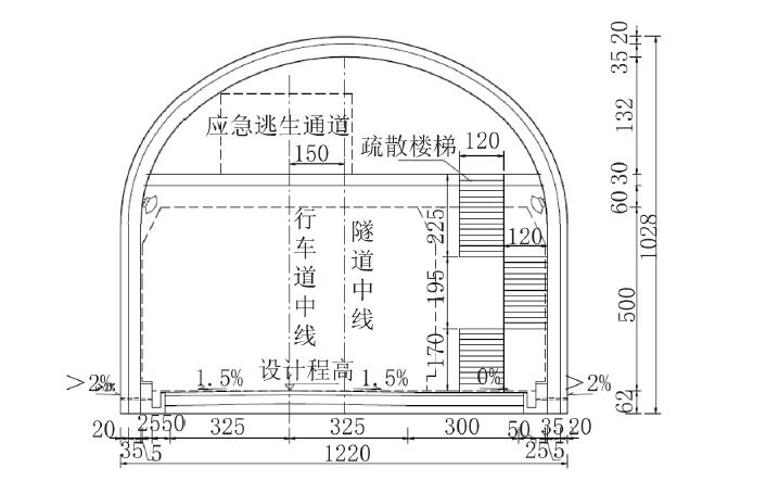 为了便于隧道逃生救援,同时节约工程投资,充分利用隧道上部空间结构设置逃生通道。根据隧道断面尺寸和功能分布,在行车道顶部设置应急逃生通道,下部为行车道,见图10。