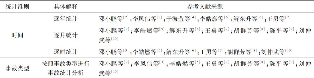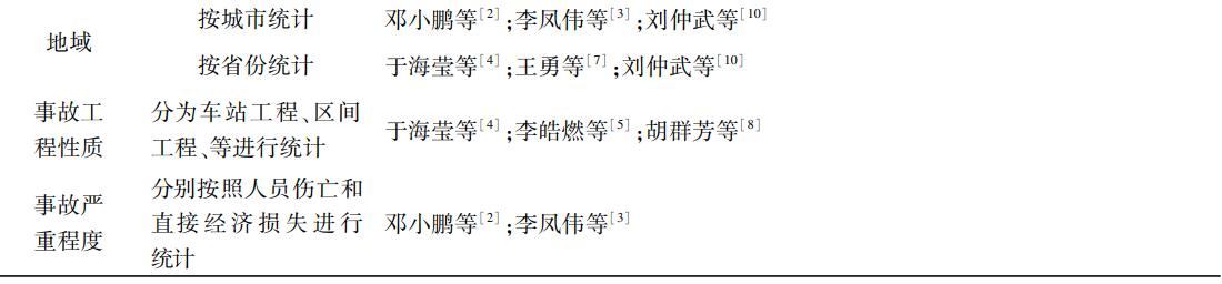 近年来不同学者就我国地铁建设安全进行了大量研究,在一定程度上促进了地铁建设安全管理的发展。部分学者针对地铁发生规律,从时间、事故类型、地域等方面进行了研究;在地铁建设事故统计分析基础上,部分学者使用了致因网络模型、文本挖掘、问卷调查等方法对地铁建设事故的致险因素进行了探索;此外,一些学者从构建地铁建设应急措施推理模型、实施视频图像分析联动预警、加强对未遂事件的识别和管理等方面就地铁建设安全管理水平的提升提出相关对策。由上述分析可知,地铁建设事故统计和规律分析为后续研究开展提供了数据支撑,是一项必不可少的基础性工作,对安全事故的态势分析和预防预警起到重要的支撑作用。