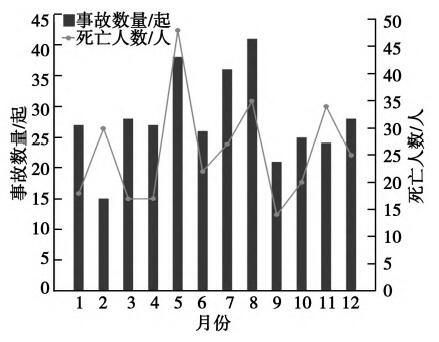 结合事故数量和死亡人数统计地铁建设事故发生的月度分布特征,可以反映出年度地铁建设事故发生的规律,如图2。