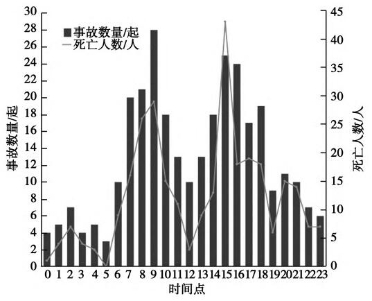 在统计的事故中,有具体时间记录的事故共307起。依据各个时间点发生的事故数量并结合死亡人数进行统计,其分布情况如图3所示。