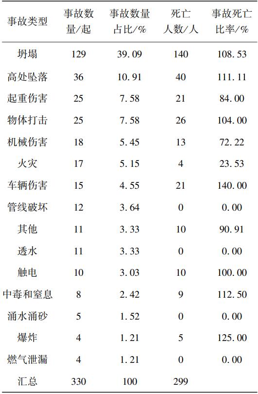 地铁建设事故类型多样,对不同类型的事故进行统计分析,可为采取针对性防控措施提供依据。参考《企业职工伤亡事故分类标准(UDC658.382-GB6441—86))》结合常见的地铁建设事故类型,按照坍塌、物体打击、车辆伤害、机械伤害、起重伤害、触电、火灾、高处坠落、透水、涌水涌砂、爆炸、中毒和窒息、管线破坏、燃气泄漏、其他等类型对有记录的330起地铁建设事故进行统计,事故类型统计情况见表2。