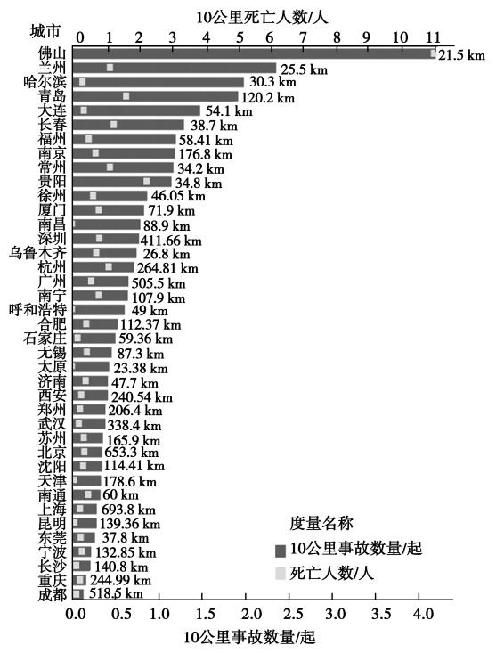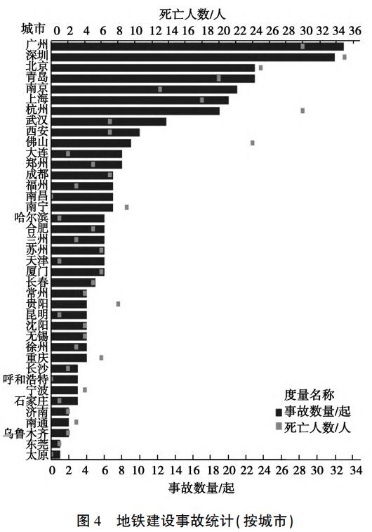10公里事故数量可以在一定程度上反映城市的地铁建设安全管理水平。2001—2020年全国39个城市的地铁建设10公里事故数量、10公里死亡人数如图6所示,事故分布的39个城市包括38个已运营地铁的城市和江苏省南通市。10公里事故数量排名前10名的城市分别是佛山、兰州、哈尔滨、青岛、大连、长春、福州、南京、常州、贵阳;10公里死亡人数排名前10名的是佛山、贵阳、青岛、长春、兰州、常州、杭州、深圳、厦门、南宁。其中佛山、青岛、兰州、长春、常州、贵阳几座城市呈现出高事故率和高死亡率并存的状态。哈尔滨、大连、福州、南京等城市小事故多发、事故发生频率较高;而杭州、深圳、厦门、南宁等城市事故强度较大,事故一旦发生后果损失较严重。统计单位标准化后,地铁建设事故总量大的广州、深圳、北京、上海等大城市10公里事故数量却并不多。这说明大城市地铁事故多发主要缘于其地铁建设时间长、建设规模大,然而其在地铁建设的过程中积累了更多经验,安全管理水平随建设周期的发展不断提升,在国内达到较高水平。而多数新修地铁的城市可能由于技术支撑不够、施工经验不足、安全管理水平较低等因素,造成地铁建设初期事故率和死亡率较高。