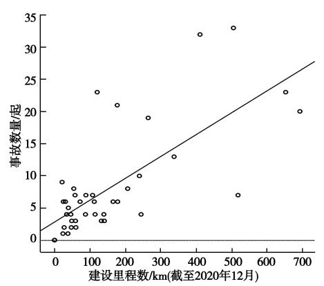 按照城市分布不同对近20年的事故数量与死亡情况进行分析,得到统计图4。图4表明,广州、深圳、北京、青岛、南京、上海、杭州、武汉、西安、佛山这10座城市的事故总数最多,占全国事故总数的60.42%。使用Tableau对各城市的线路建设里程数(即截至2020年的地铁运营里程数)和事故数量进行回归分析,发现p<0.000 1、R2=0.514 471,地铁建设事故数量与城市的建设线路长度具有显著的正相关关系(如图5)。而从事故死亡人数来看,深圳、广州、杭州居于其首,北京、佛山、青岛、上海、南宁、贵阳等城市次之。