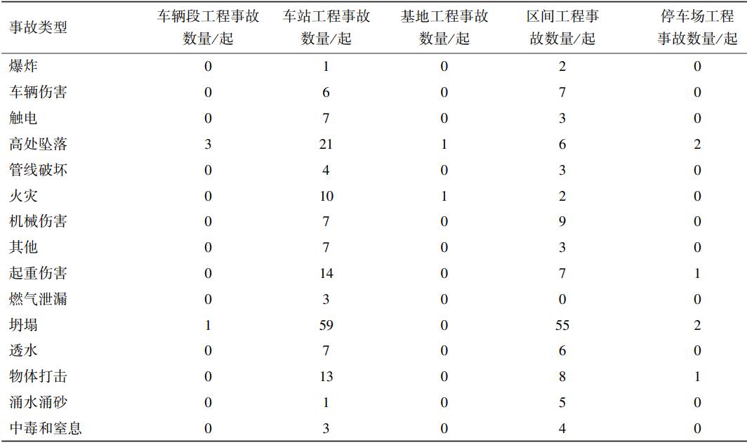 由表3可知,坍塌、爆炸、中毒和窒息等事故多发生在车站工程和区间工程。高处坠落事故在各种工程中均有发生,其分布最为广泛。在车站工程施工时更易发生高处坠落、火灾、起重伤害、物体打击事故。