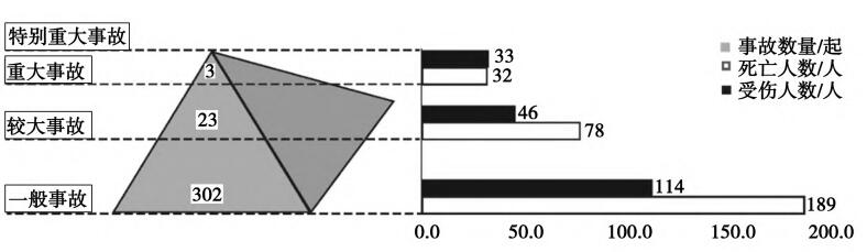 统计结果表明,在我国的地铁建设过程中发生过一般事故302起,较大事故23起,重大事故3起,没有发生过特别重大事故。大部分地铁建设事故死亡人数都在3人以下,其中1人死亡的事故137起,在伤亡事故中所占比例最高。此外,在一般事故中有相当一部分没有造成人员伤亡,但是其所造成的工期延误、经济损失和社会影响不容忽视。