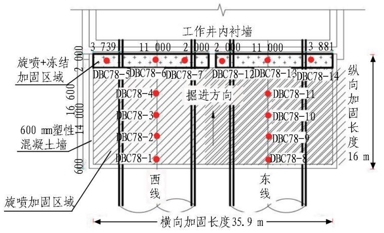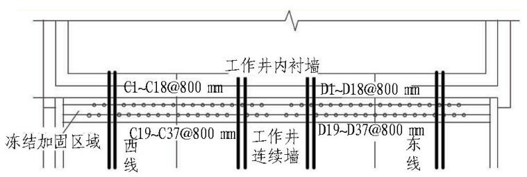 素墙区域通过环箍注浆加强了隔水效果。 采用垂直冻