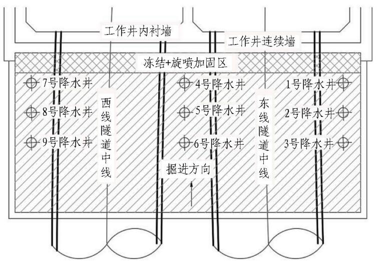 由于地下水压大、水头高,为减少接收时洞门涌水风险。 在盾构掘进至冷冻墙体附近时,开始在端头井内进行井管降水,将地下水位控制在盾构洞门以下,至临时洞门封堵完成后,停止降水。
