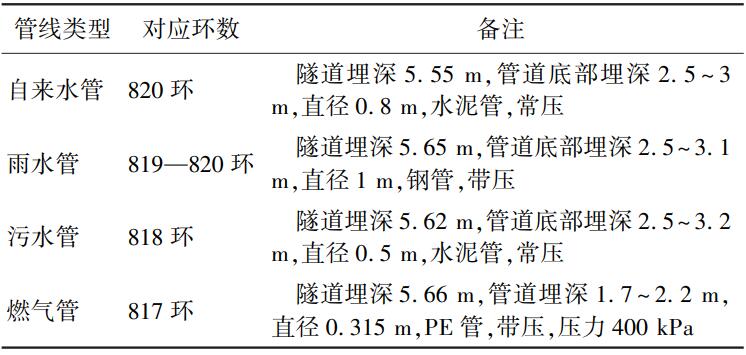 到达段地层主要以砂卵石为主,且在 817 环至820 环盾构相继穿越雨污水、自来水、燃气管线等风险源,下穿管线情况如表 2 所示。
