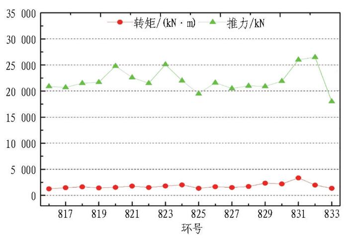 为保证盾构安全通过加固区,在加固区掘进时速度要放缓至 5~10 mm / min,泥水压力根据监测数据及时调整并严格控制,保持低速度、小推力、小转矩连续推进。 加固区沉降量如图 8 和图 9 所示,DBC78-1 ~DBC78-7 为东线隧道加固区 7 个监测点,DBC71-8 ~DBC71-14 为西线隧道加固区的 7 个监测点,具体布置见图 3。 东线隧道加固区最大地表沉降量在 3 mm以内,西线加固区最大地表沉降量控制在 5 mm 以内。加固区穿越段,刀盘推力及转矩如图 10 所示,推力和转矩保持平稳,保证了盾构的持续安全掘进。