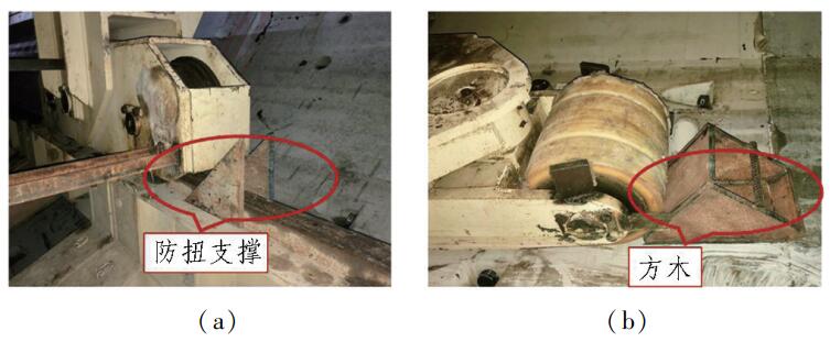 盾构刀盘破开洞门进入工作井后,切口压力逐步下调直至 0 kPa,继续向前推进,推进过程中屏蔽泥水循环,掘进速度控制在 20~ 25 mm,掘进过程中观察盾构同基座的位置关系。 如图 11 所示,推进完成后在拼装时需要及时在盾体左右两侧、刀盘前部和后配套台车轮位置焊接防扭支撑或填塞方木等,对机体固定防止盾构滑移。