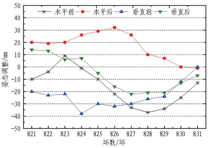 西线隧道推进过程中,818 环盾构姿态出现机头左飘现象,盾构姿态相对于设计轴线偏差逐渐增大。针对这种情况,采用克泥效单点注入,在中盾左侧偏下位置每环注入量控制在 1 m3 左右,以增加土体对盾构主机的左侧推力。 在推进过程中,屏蔽右侧油缸,增加左右两侧推力差值。 在推进过程中要严格控制推进速度(8~ 10 mm / min),避免速度过快,影响纠偏。 经过逐步调整,待西线隧道推进至 831 环,盾构姿态已经明显纠正(如图 12 所示),保证了盾构的顺利出洞,主机可以步入钢基座。