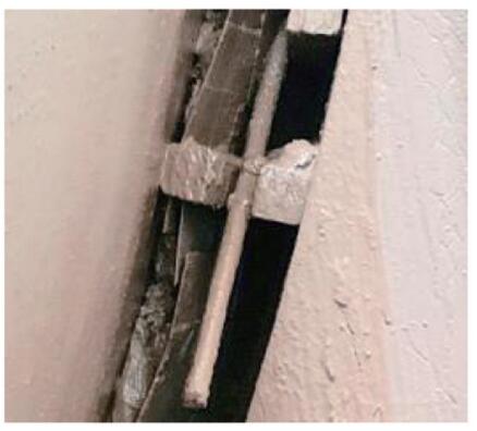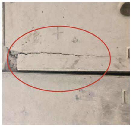 如图 13 和图 14 所示,东线隧道接收环管片加固仅使用连接板进行连接,出现接收环管片开裂情况,而西线隧道使用连接板并焊接槽钢,管片未出现开裂。