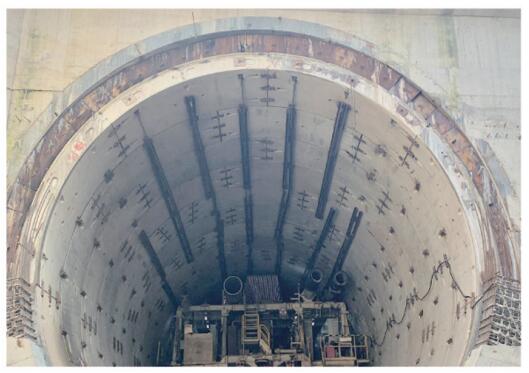 2)素墙区域环箍注浆及加固区二次注浆。 为保证接收端加固区隔水效果,当盾构进入加固区后,塑性混凝土墙前后 6 环管片通过二次注浆形成环箍来保证加固区止水效果,该管片每环预留 22 根注浆孔,方便环箍二次注浆施工。 由于盾构接收时同步注浆浆液仍在凝固过程中,可能存在局部不均匀、浆液的凝固收缩和浆液的稀释流失,为提高背衬注浆层的防水性及密实度,有效填充管片后的环形间隙,根据监测结果,必要时对加固区其他管片进行二次补强注浆。 施工时采用地表沉降监测信息反馈,结合洞内管片沉降和渗漏水情况,综合判断是否需要进行二次补强注浆,二次补强注浆材料以水泥浆和水玻璃为主。 注入过程中观察注入压力避免浆液进入盾尾。