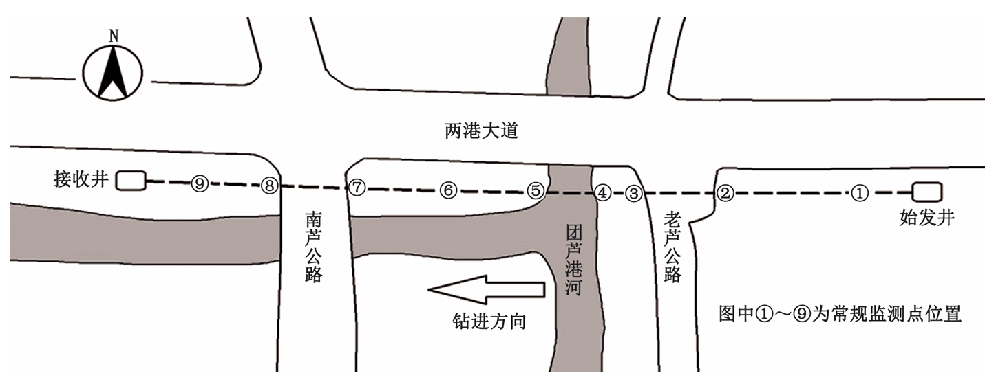 做好地下管线的勘查及校核,确保施工轴线不与其他管网冲突。如图1所示,导向孔自起始点向东钻进,先后横穿老芦公路(宽度35m)、团芦港河(宽度55m)、南芦公路(宽度52m),其余地面情况为市政绿化带(包含草坪及矮灌木丛)。对于穿越如路面、河道等无法实时监测的情况,把道路两侧人行道和河岸两端设置的监测点列为重点监测对象。本工段设置的常规监测点共9处,自始发井向西往接收井方向依次设置。如图1所示,在道路及河道两端各设有1处监测点(图1中老芦公路两侧设置②、③,团芦港河两岸设置④、⑤,南芦公路两侧设置⑦、⑧),其余3处监测点分别设置在靠近起、终点和施工中段(图1中①、⑥、⑨)。