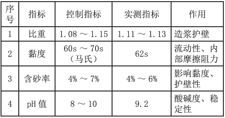 护壁泥浆的使用是钻孔施工防止孔壁坍塌最直接的技术手段。根据《水平定向钻法管道穿越工程技术规程》(CECS 382-2014)中列出的泥浆指标数据,并结合参考地下连续墙和钻孔灌注桩相关的技术规范《地下铁道工程施工及验收规范》(GB50299-1999)中泥浆配置、管理性能指标表格和施工经验,以及其他论文著作的表述,本次施工中管径达到1m,必须将孔径扩至1400mm以上,加之穿越土层含沙量较高,泥浆配比要求比较高。为达到泥浆护壁效果,防止塌孔,将泥浆配比参数预设如表2中所示。