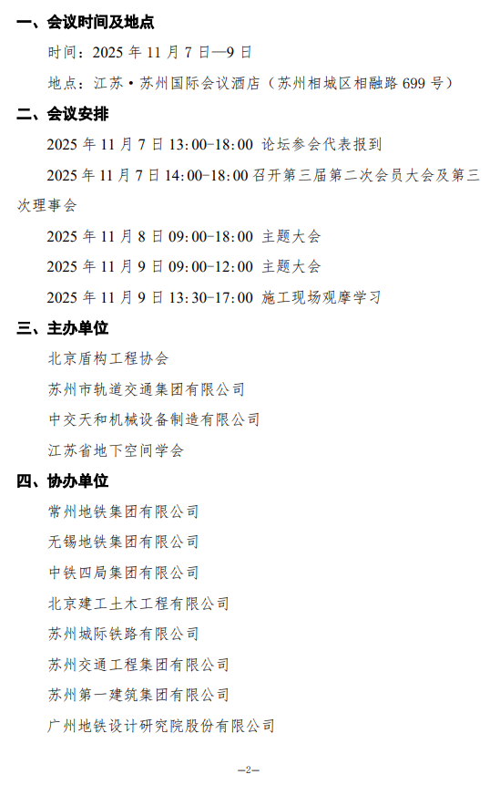摘 要:“第二届盾构工程技术青年创新论坛”将于2025年11月7日至9日在苏州国际会议酒店举行,邀请各单位积极组织相关人员参会交流。