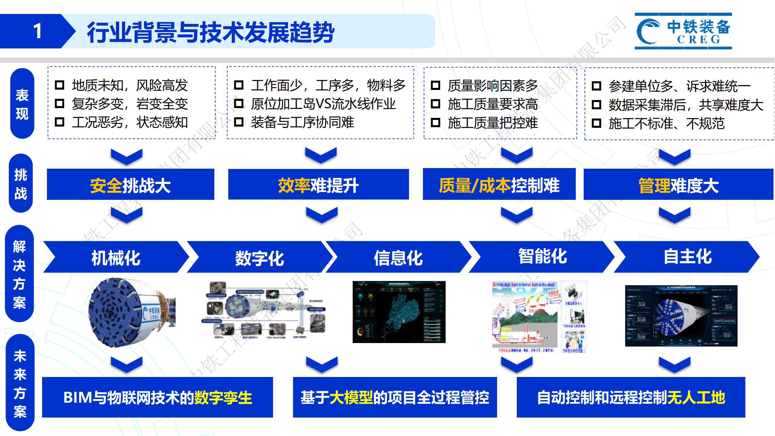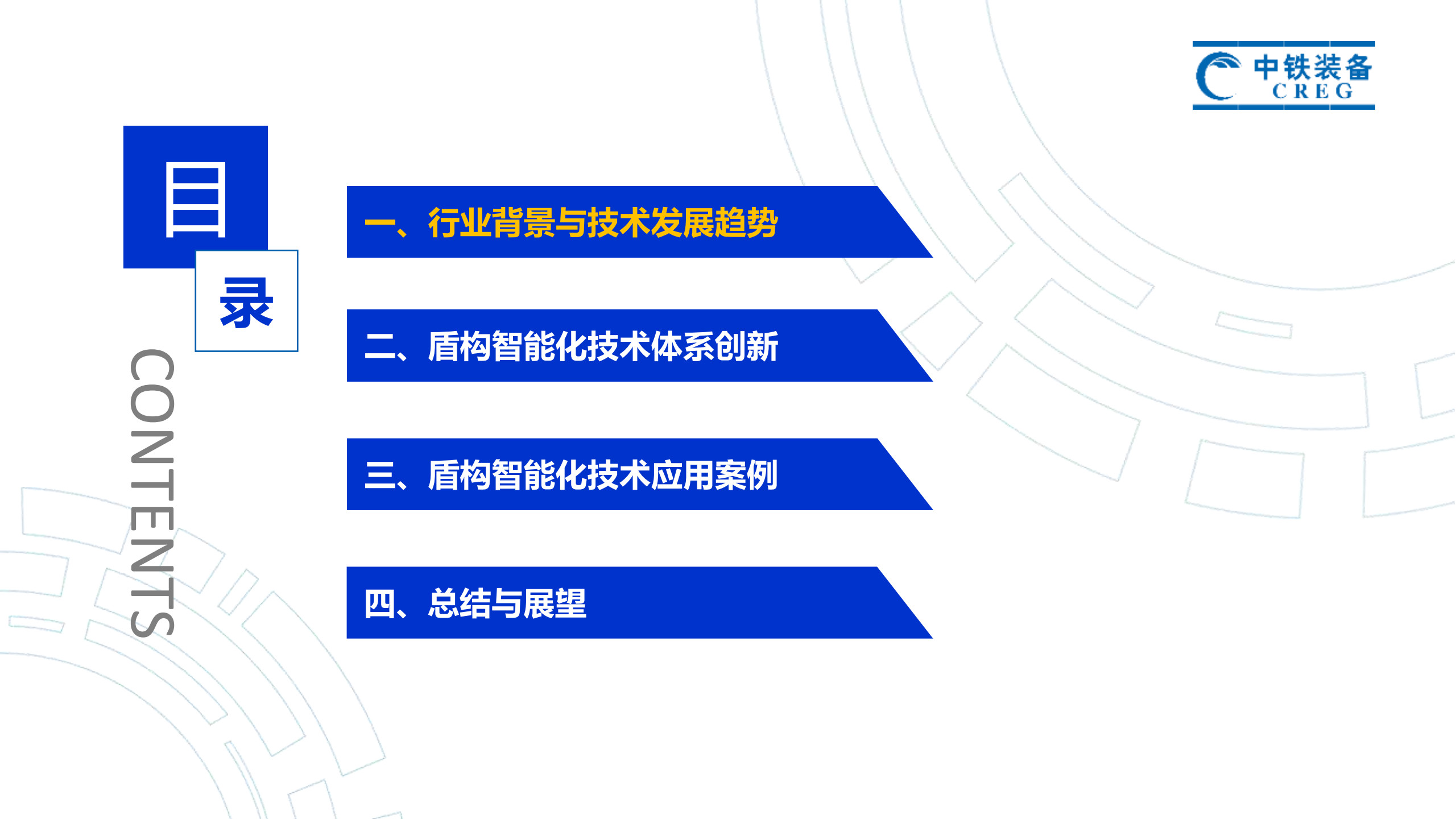 报告介绍了大直径盾构智能化技术行业背景与技术发展趋势,盾构智能化技术体系创新,盾构智能化技术应用案例和总结与展望。