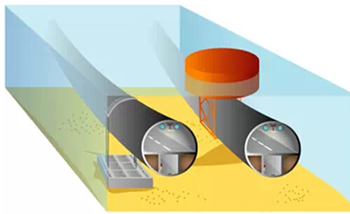 同时,沉管隧道有一种特殊的形式——悬浮隧道,其特殊性表现在沉管管段不是埋在河底沟槽内,而是悬浮于水中,隧道用锚索锚固于一定间隔的海底锚座上,锚索另一端则通过各固定在隧道上的套环与隧道主体结构相连。