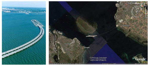 2006年建成的丹麦与瑞典的厄勒海峡通道工程全长16km,其中西侧海底隧道长4050m,宽38.8m,高8.6m,位于海底10m以下,由5条管道组成,他们分别是两条火车道、两条双车道公路和一条疏散通道,是目前世界上最宽敞的海底隧道;中间的人工岛长4055m,将两侧工程连在一起;东侧跨海大桥全长7845m,上为4车道高速公路,下为对开火车道,共有51座桥墩,中间是斜拉索桥,跨度490米,高度55米,是目前世界上已建成的承重量最大的斜拉索桥。