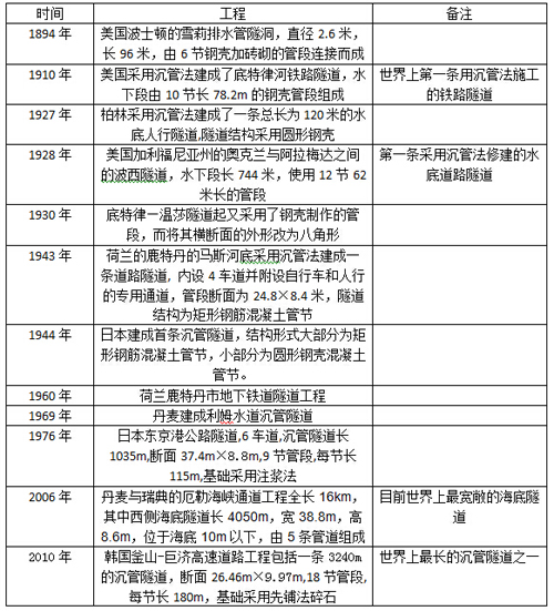 第一条用沉管法施工成功的是美国波士顿的雪莉排水管隧洞,于1894年建成,直径2.6米,长96米,由6节钢壳加砖砌的管段连接而成。
