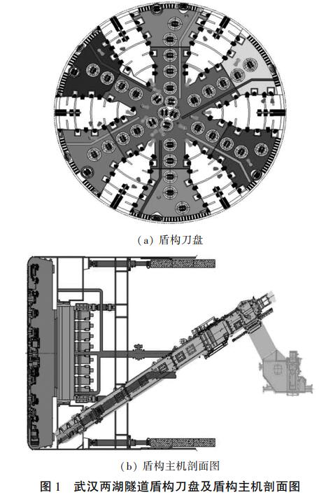 武汉两湖隧道东湖段采用直径 15 m 级的岩石复合常压刀盘盾构(如图 1 所示)施工,穿越地层为泥岩、灰岩、局部泥质粉砂岩及粉质黏土。 为解决盾构掘进过程中刀盘结泥饼、滞排、堵舱等导致掘进效率低的问题,选用大直径泥水岩石复合常压盾构,并在 15 m 级超大直径盾构中首次采用气垫螺旋机直排技术。