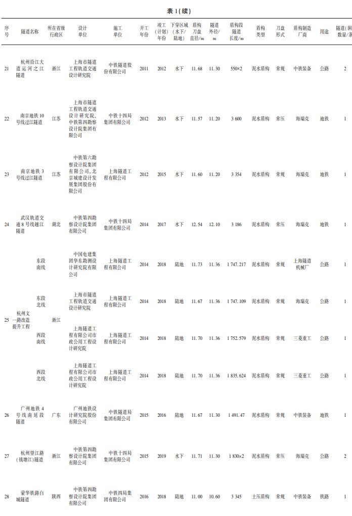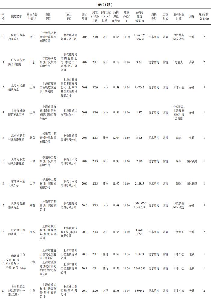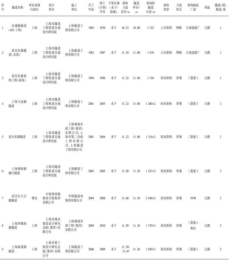 2004 年 9 月,上海黄浦江复兴东路双线隧道贯通运营,是我国第 1 条单管双层盾构隧道,也是世界上最早运营的双层盾构隧道。 该盾构刀盘直径 11. 22 m,隧道外径 11. 00 m,采用上层双车道、下层大车单车道双层双管 6 车道方式设计。上海长江隧道盾构于 2006 年开工,2009 年竣工。盾构隧道长 7 476 m,为双管双向 6 车道,隧道下层预留轨道交通,隧道外径 15. 00 m、内径 13. 7 m,盾构刀盘直径 15. 43 m,最深处埋深 55 m,为当时国内直径最大、一次性掘进距离最长的盾构隧道代表性工程。南京长江隧道[11]