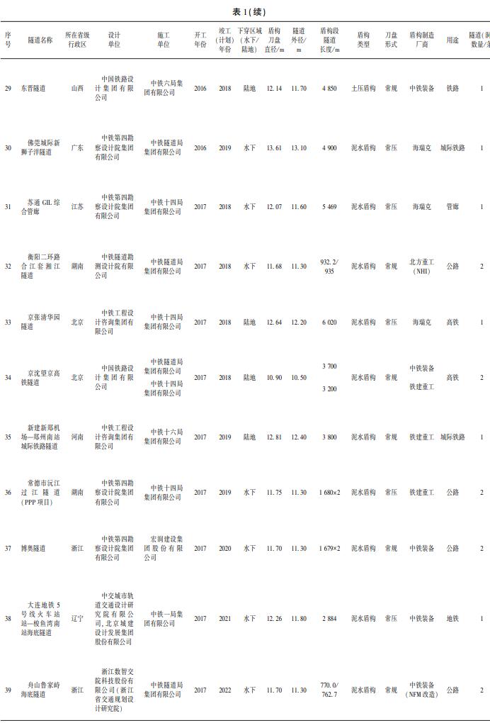 表 1 截至 2021 年底我国 10~ 14 m 大直径盾构隧道统计表