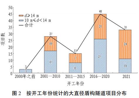 按开工年份统计的大直径盾构隧道项目分布见图 2。