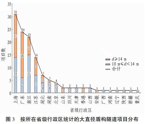 按所在省级行政区统计的大直径盾构隧道项目分布如图 3 所示。 由图可以看出,上海市修建的大直径盾构隧道最多,为 31 项,其次是广东省、浙江省和江苏省。 浙江省抓住 2022 年亚运会发展时机,大力开展城市快速道路改造和过江地铁、公路建设,上海市、江苏
