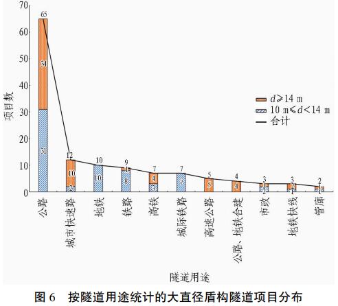 按隧道用途统计的大直径盾构隧道项目分布见图6。 从图 6 可以看出,公路隧道项目最多,为 65 项,占比约 52%,其次是城市快速路、地铁、铁路和高铁隧道等项目。